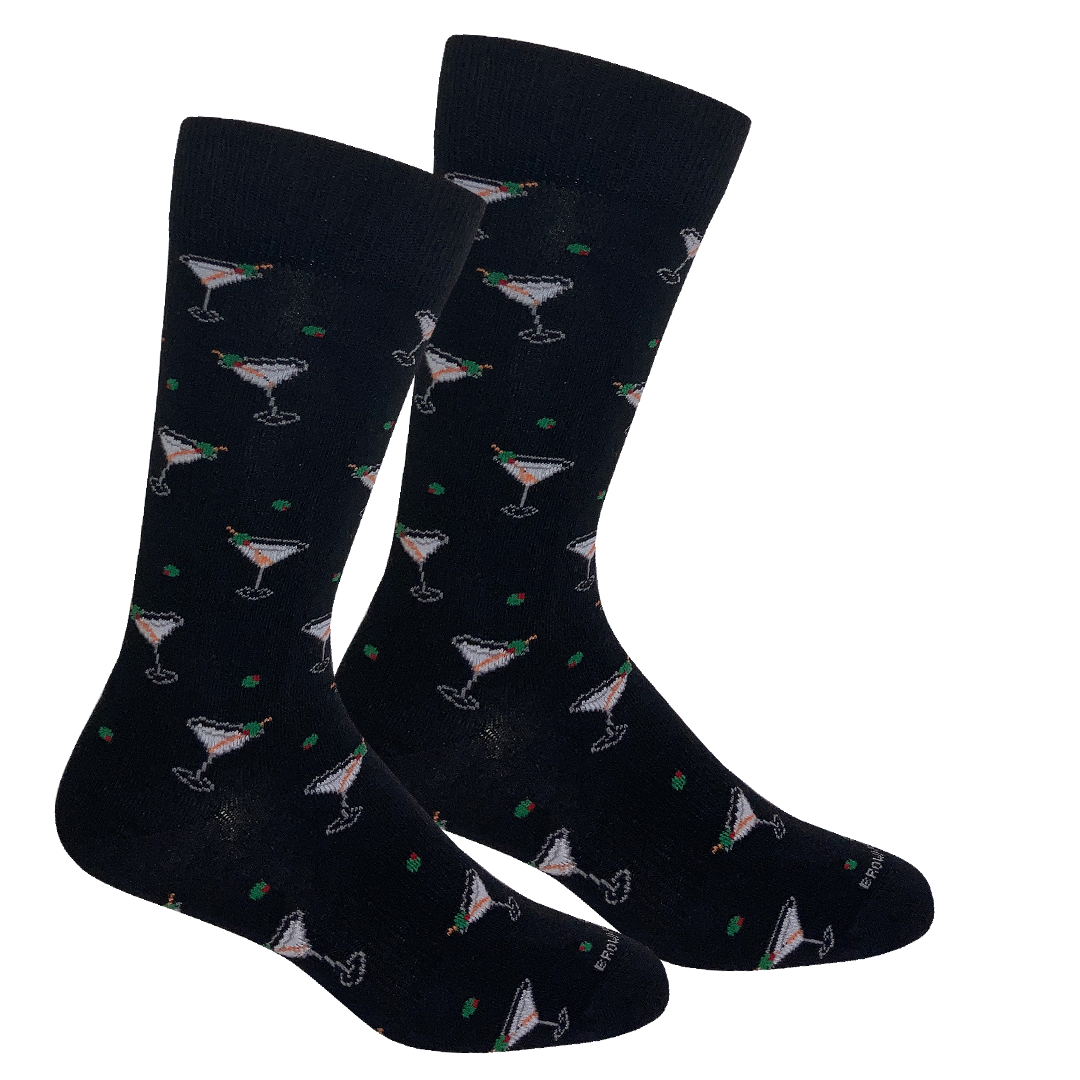 Add a splash of style to your step with our Martini Crew Socks! Featuring a playful martini glass pattern complete with green olive accents, these socks bring cocktail hour flair to any outfit. Whether you’re dressing up for a night out or kicking back with friends, the soft cotton blend keeps your feet feeling as good as you look. Available in classic Black or crisp Cream for a look that’s shaken, not stirred.