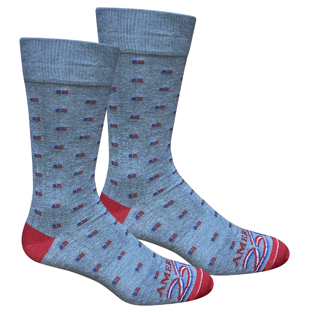 A refined and sophisticated way to show your national pride. These socks feature a discreet, all-over pattern of tiny American flags on a neutral grey base, offering a classy patriotic statement perfect for business or casual wear.